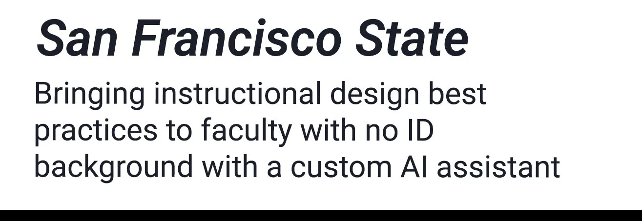 The Problem: Most faculty at San Francisco State University are subject matter experts, not instructional designers. Without an ID background, it's difficult to know whether a course is truly aligned to its objectives, accessible to all learners, or grounded in established learning principles (such as Bloom's Taxonomy, Universal Design for Learning, and Transparency in Learning and Teaching). The result is courses that are well-intentioned but fall short of best practices—which ultimately affects the quality of the student experience and, with it, retention.