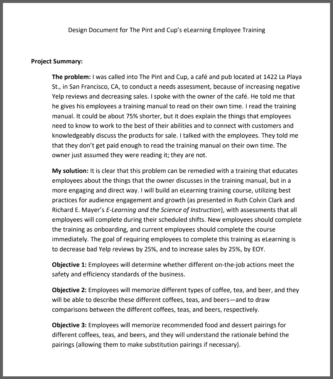 I created a design document to facilitate and illustrate my design of a Computer Based Training (CBT) Reusable Learning Object (RLO) for the training of brand-new and existing associates at The Pint & Cup Cafe.